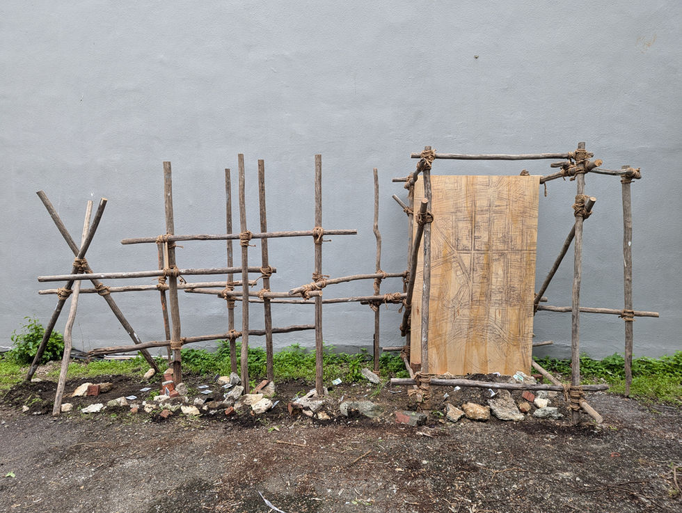 2024, UV print of hand-drawn map on plywood, instant films, wooden structure with found stones and debris